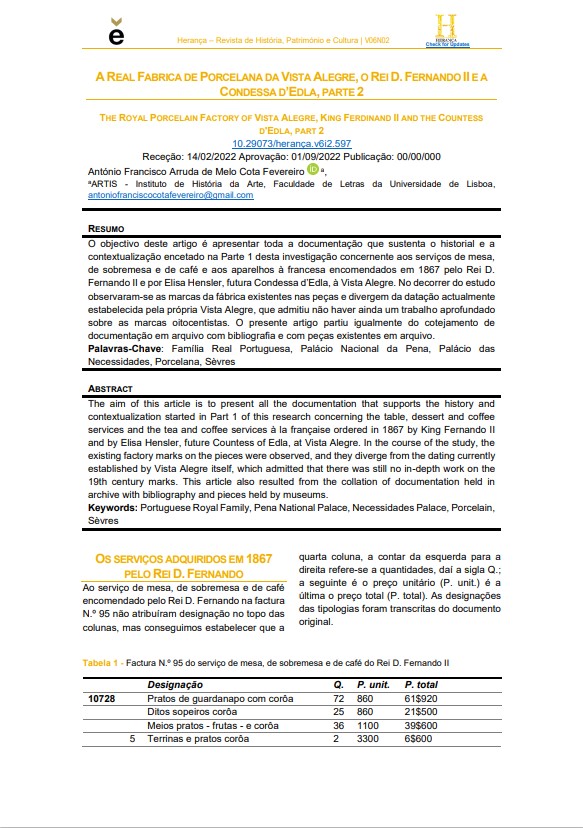 No Palácio Nacional da Pena há parte de um serviço de mesa e de sobremesa Vista Alegre com o monograma coroado do Rei D. Fernando II, que se sabe ter sido inventariado em 1887, após a sua morte, e como adquirido depois do seu segundo casamento, em 1869, com a Condessa d’Edla, mas recentemente tem sido divulgado que os serviços foram oferecidos ou encomendados em 1852 ao monarca pela Vista Alegre. Efectivamente, temos vindo a encontrar documentação que cabalmente comprova que foram adquiridos em 1867 conjuntamente com outros, cotejada com bibliografia e peças existentes em instituições museológicas. Este estudo foi complementado com outras peças da mesma porcelana que pertenceram a ambos e é aqui dado a conhecer.