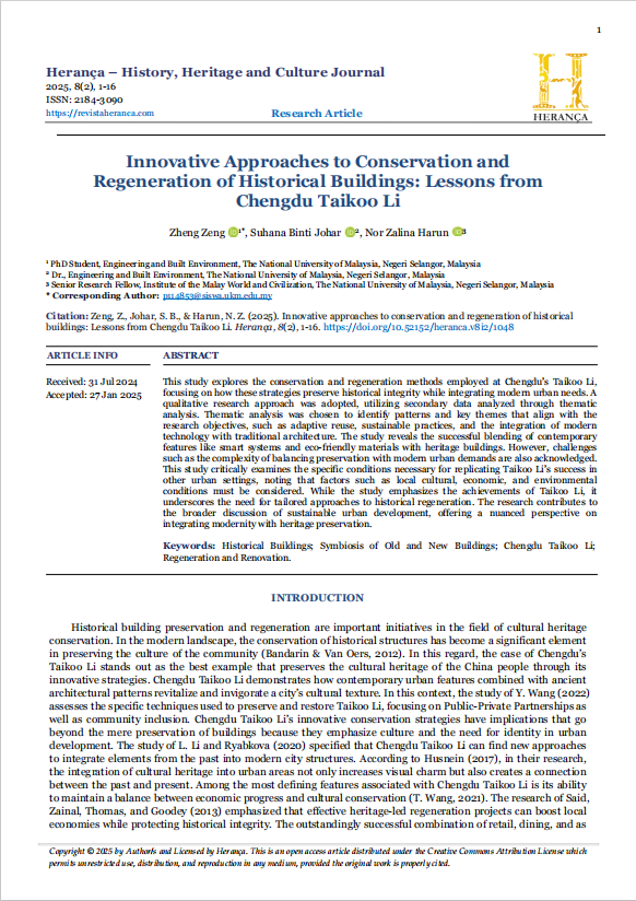 This study explores the conservation and regeneration methods employed at Chengdu’s Taikoo Li, focusing on how these strategies preserve historical integrity while integrating modern urban needs. A qualitative research approach was adopted, utilizing secondary data analyzed through thematic analysis. Thematic analysis was chosen to identify patterns and key themes that align with the research objectives, such as adaptive reuse, sustainable practices, and the integration of modern technology with traditional architecture. The study reveals the successful blending of contemporary features like smart systems and eco-friendly materials with heritage buildings. However, challenges such as the complexity of balancing preservation with modern urban demands are also acknowledged. This study critically examines the specific conditions necessary for replicating Taikoo Li’s success in other urban settings, noting that factors such as local cultural, economic, and environmental conditions must be considered. While the study emphasizes the achievements of Taikoo Li, it underscores the need for tailored approaches to historical regeneration. The research contributes to the broader discussion of sustainable urban development, offering a nuanced perspective on integrating modernity with heritage preservation.