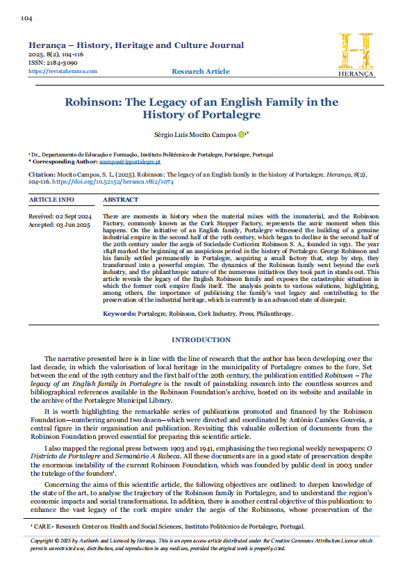 There are moments in history when the material mixes with the immaterial, and the Robinson Factory, commonly known as the Cork Stopper Factory, represents the auric moment when this happens. On the initiative of an English family, Portalegre witnessed the building of a genuine industrial empire in the second half of the 19th century, which began to decline in the second half of the 20th century under the aegis of Sociedade Corticeira Robinson S. A., founded in 1931. The year 1848 marked the beginning of an auspicious period in the history of Portalegre. George Robinson and his family settled permanently in Portalegre, acquiring a small factory that, step by step, they transformed into a powerful empire. The dynamics of the Robinson family went beyond the cork industry, and the philanthropic nature of the numerous initiatives they took part in stands out. This article reveals the legacy of the English Robinson family and exposes the catastrophic situation in which the former cork empire finds itself. The analysis points to various solutions, highlighting, among others, the importance of publicising the family's vast legacy and contributing to the preservation of the industrial heritage, which is currently in an advanced state of disrepair.