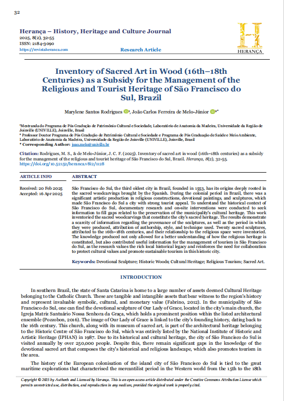 São Francisco do Sul, the third oldest city in Brazil, founded in 1553, has its origins deeply rooted in the sacred woodcarvings brought by the Spanish. During the colonial period in Brazil, there was a significant artistic production in religious constructions, devotional paintings, and sculptures, which made São Francisco do Sul a city with strong tourist appeal. To understand the historical context of São Francisco do Sul, documentary research and on-site interventions were conducted to seek information to fill gaps related to the preservation of the municipality's cultural heritage. This work inventoried the sacred woodcarvings that constitute the city's sacred heritage. The results demonstrate a scarcity of information regarding the provenance of the sculptures, as well as the period in which they were produced, attribution of authorship, style, and technique used. Twenty sacred sculptures, attributed to the 16th–18th centuries, and their relationship to the religious space were inventoried. The knowledge produced not only allowed for a better understanding of how the religious heritage is constituted, but also contributed useful information for the management of tourism in São Francisco do Sul, as the research values the rich local historical legacy and reinforces the need for collaboration to protect cultural values and promote sustainable tourism in this historic city.