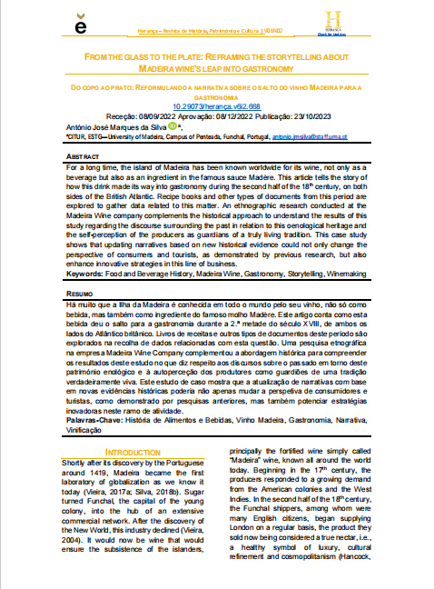 Since a long time ago, the Madeira Island is known all around the planet for its wine, not only as drink but also as an ingredient of the famous sauce Madère. This paper is about how this beverage made the leap into the gastronomy during the 2nd half of the 18th century, in both sides of the British Atlantic. Cookbooks and other kinds of documents from this period are explored to collect evidence related to this issue. An ethnological fieldwork within the Madeira Wine Company completed the historical approach to understand the potential outcomes of this study in what concerns the storytelling making about this drinkable heritage and the self-perception of producers as guardians of a true living tradition.