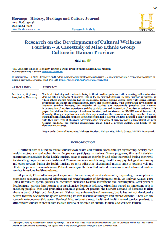 Cultural Resources, Wellness Tourism, Hainan Miao Ethnic Group, RMFEP FrameworkAbstract