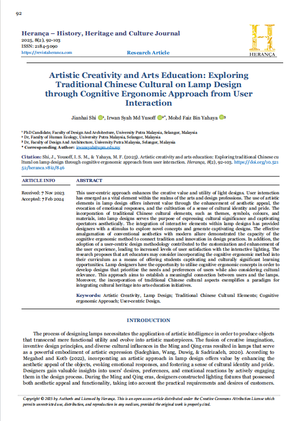 This user-centric approach enhances the creative value and utility of light designs. User interaction has emerged as a vital element within the realms of the arts and design professions. The use of artistic elements in lamp design offers inherent value through the enhancement of aesthetic appeal, the evocation of emotional responses, and the cultivation of a sense of cultural identity and pride. The incorporation of traditional Chinese cultural elements, such as themes, symbols, colours, and materials, into lamp designs serves the purpose of expressing cultural significance and captivating spectators aesthetically. The integration of interactive elements within lamp designs has provided designers with a stimulus to explore novel concepts and generate captivating designs. The effective amalgamation of conventional aesthetics with modern allure demonstrated the capacity of the cognitive ergonomic method to connect tradition and innovation in design practices. In addition, the adoption of a user-centric design methodology contributed to the customization and enhancement of the user experience, leading to increased levels of user satisfaction with the interactive lighting. The research proposes that art educators may consider incorporating the cognitive ergonomic method into their curriculum as a means of offering students captivating and culturally significant learning opportunities. Lamp designers have the opportunity to utilise cognitive ergonomic concepts in order to develop designs that prioritise the needs and preferences of users while also considering cultural relevance. This approach aims to establish a meaningful connection between users and the lamps. Moreover, the incorporation of traditional Chinese cultural aspects exemplifies a paradigm for integrating cultural heritage into arts education initiatives.