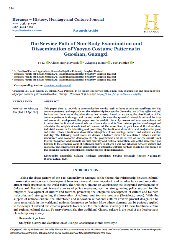 Intangible Cultural Heritage, Experience Service, Mountain Yaoyao Nationality, Dissemination, PathAbstract