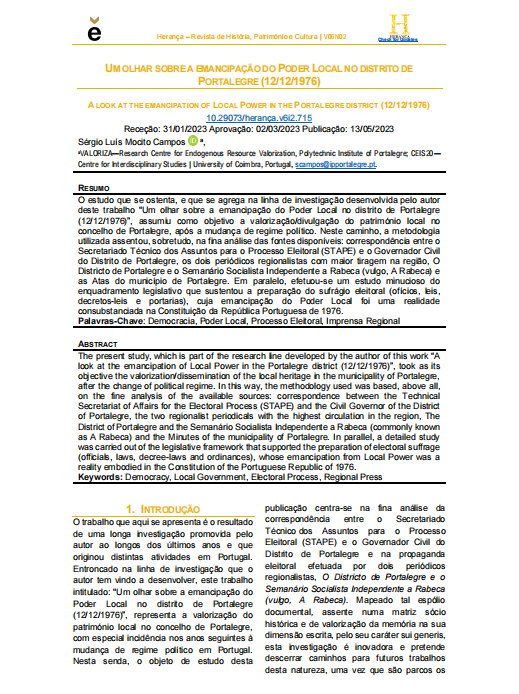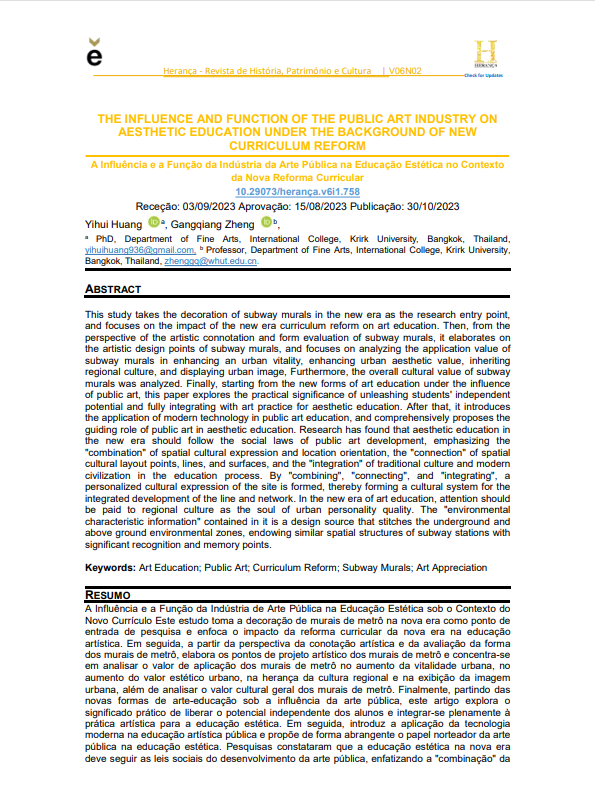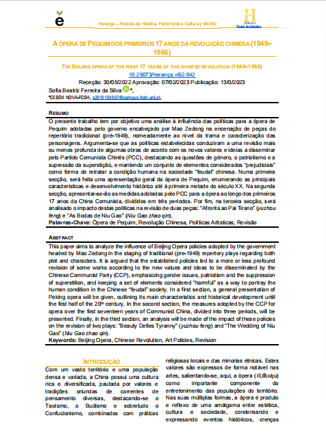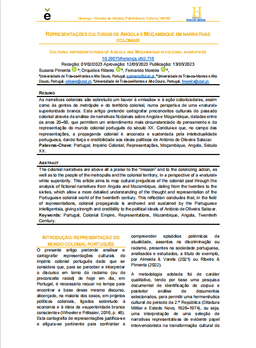 Herança – History, Heritage and Culture Journa is a biannual magazine dedicated to the plurality of themes involving History, Heritage and Culture. It will cover the various strands of knowledge with special emphasis on History, Archeology, Architecture, Art History, Theory of Art, Museology and Museography, Curatorial Studies, Heritage Inventory and Safeguarding, Heritage Sciences, Conservation and Restoration, Management and Studies of Culture and Cultural Tourism. In order to disseminate studies supported by broad and multidisciplinary perspectives, which stand out for their quality and originality, the scientific articles will be published in English, aimed at researchers and professionals in the field of Social and Human Sciences all over the world.